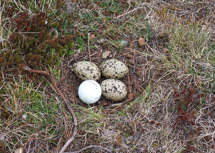 „Sannarlega getur nú margt skondið og skemmtilegt skeð í golfi. Það sannaðist vel þegar ég var að spila á Jaðarsvelli á Akureyri í dag. Á 2.braut átti ég högg í átt að holu (eða það átti að stefna þangað!) en eins og stundum gerist lenti kúlan nokkuð til hliðar við holuna, framan við grjótmel og skoppaði kúlan upp í melinn. Þegar ég kom svo að melnum til að finna kúluna tóku á móti mér tjaldahjón og höfðu hátt eins og þeir fuglar eiga til. Ég varð hins vegar steinhissa þegar ég sá ástæðuna. Kúlan hafði rúllað alla leið inn í hreiðrið þeirra og var snyrtilega við hlið þriggja eggja sem voru stráheil! Tjaldurinn gerði heiðarlega tilraun til að leggjast ofan á eggin og kúluna en var hundfúll með þessa óumbeðnu viðbyggingu í hreiðrinu. Og hafði hátt þegar ég tók síðan kúluna úr hreiðrinu en lagðist snarlega á eggin þegar ég sló kúluna og kom mér í burtu. Ég hef fengið fugl í golfi en aldrei þrjú egg og tjaldapar.“